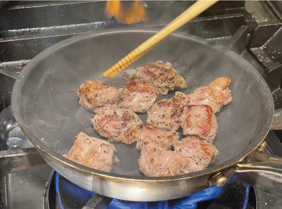 ①食べやすい大きさにカットした牛肉を焼く
