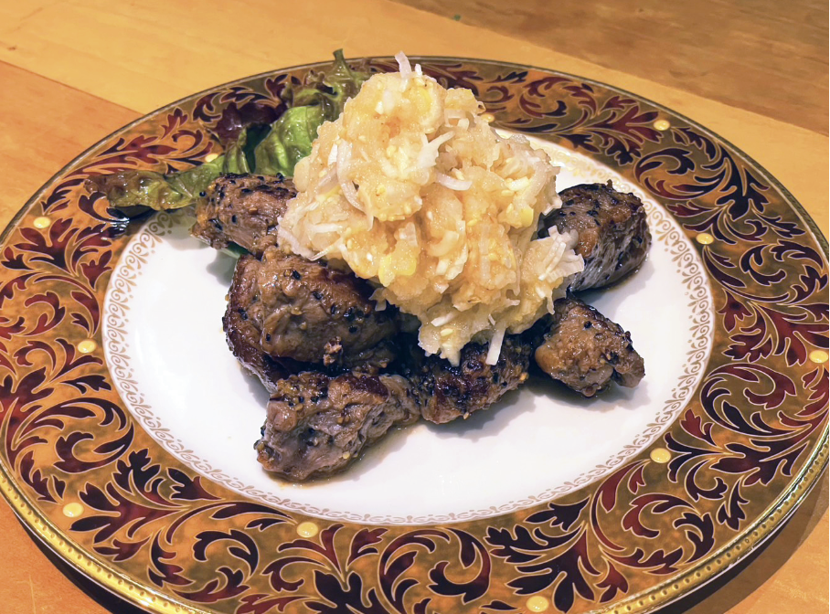 ジューシーなサイコロステーキを、大根おろしと鶯宿梅でさっぱりと。