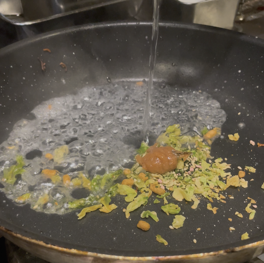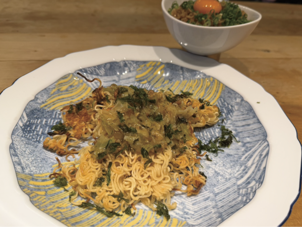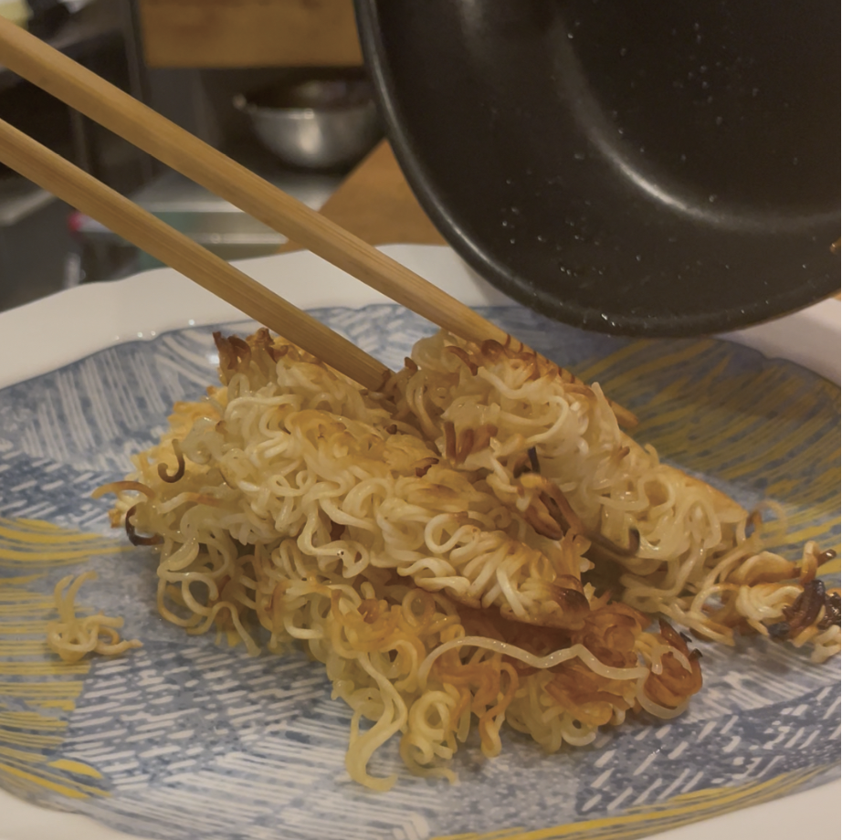 ⑥ペヤングのかやくと鶯宿梅をフライパンに入れる