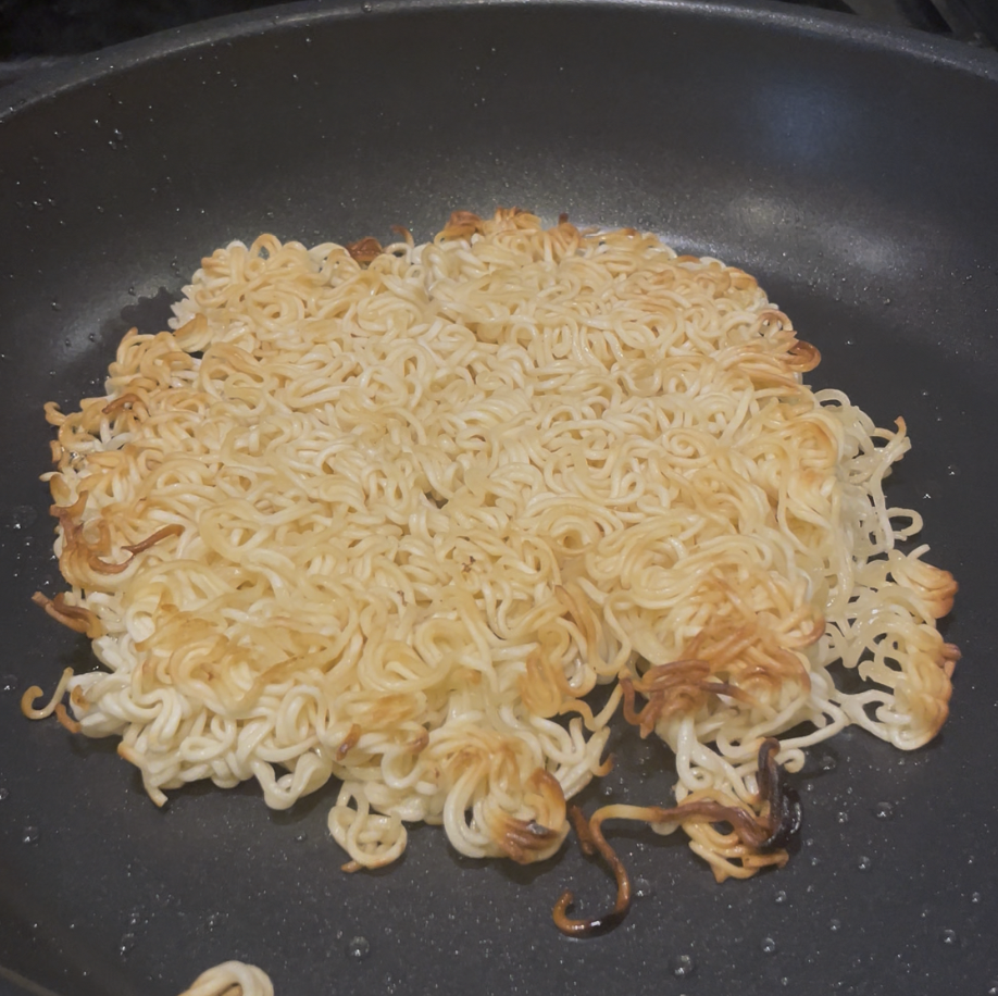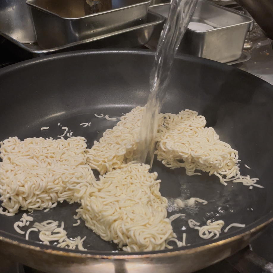 ②フライパンにペヤングの麺を割り入れて水を注ぐ